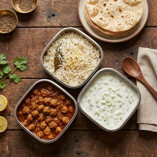 Soyabean Aloo Masala & Pulao Meal with Raita & RotiHomestyle Soyabean aloo masala, served with Pulao, soft roti, and fresh Raita- simple, tasty, and satisfying.