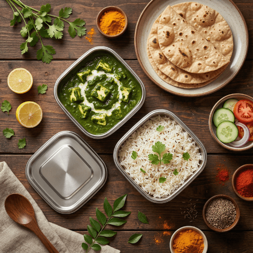 Palak Paneer / Matar Paneer Meal with Jeera Rice, Roti & SaladHomestyle palak paneer or rich matar paneer, served with fragrant jeera rice, soft roti, and fresh salad - comforting and wholesome.